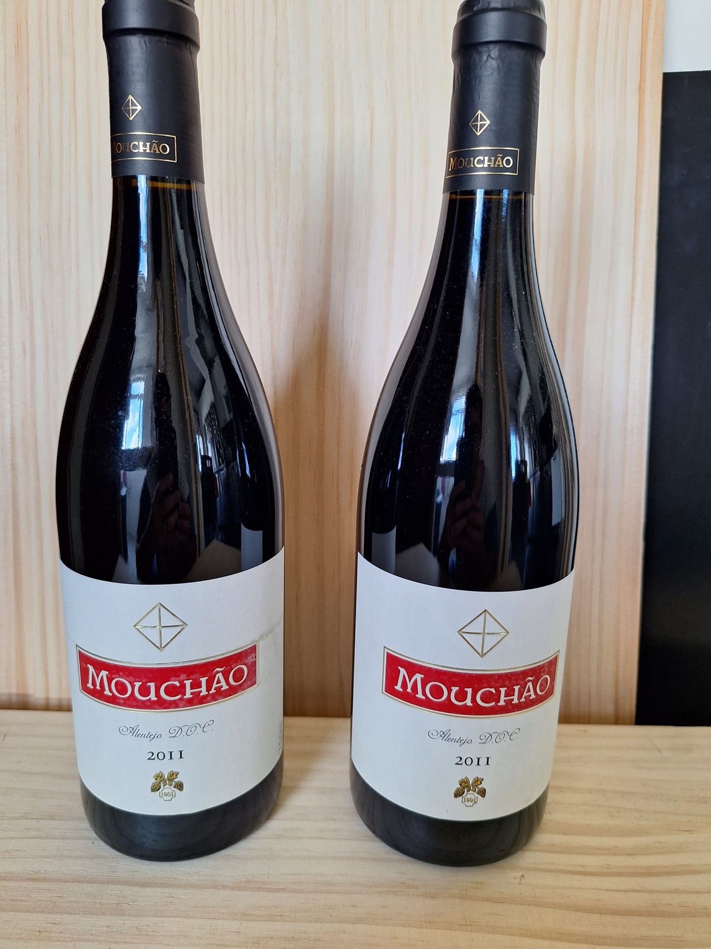 • Duas garrafas de vinho tinto Mouchão 2011 com rótulo branco e vermelho sobre mesa de madeira clara