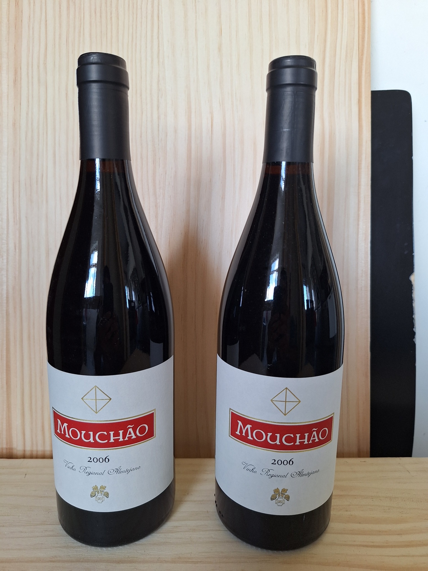 Duas garrafas de vinho Mouchão 2006 sobre madeira clara