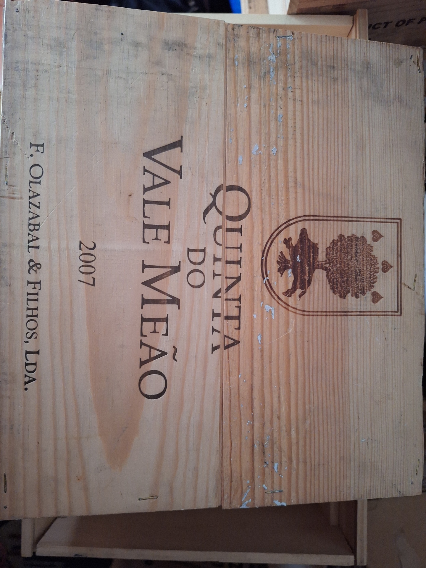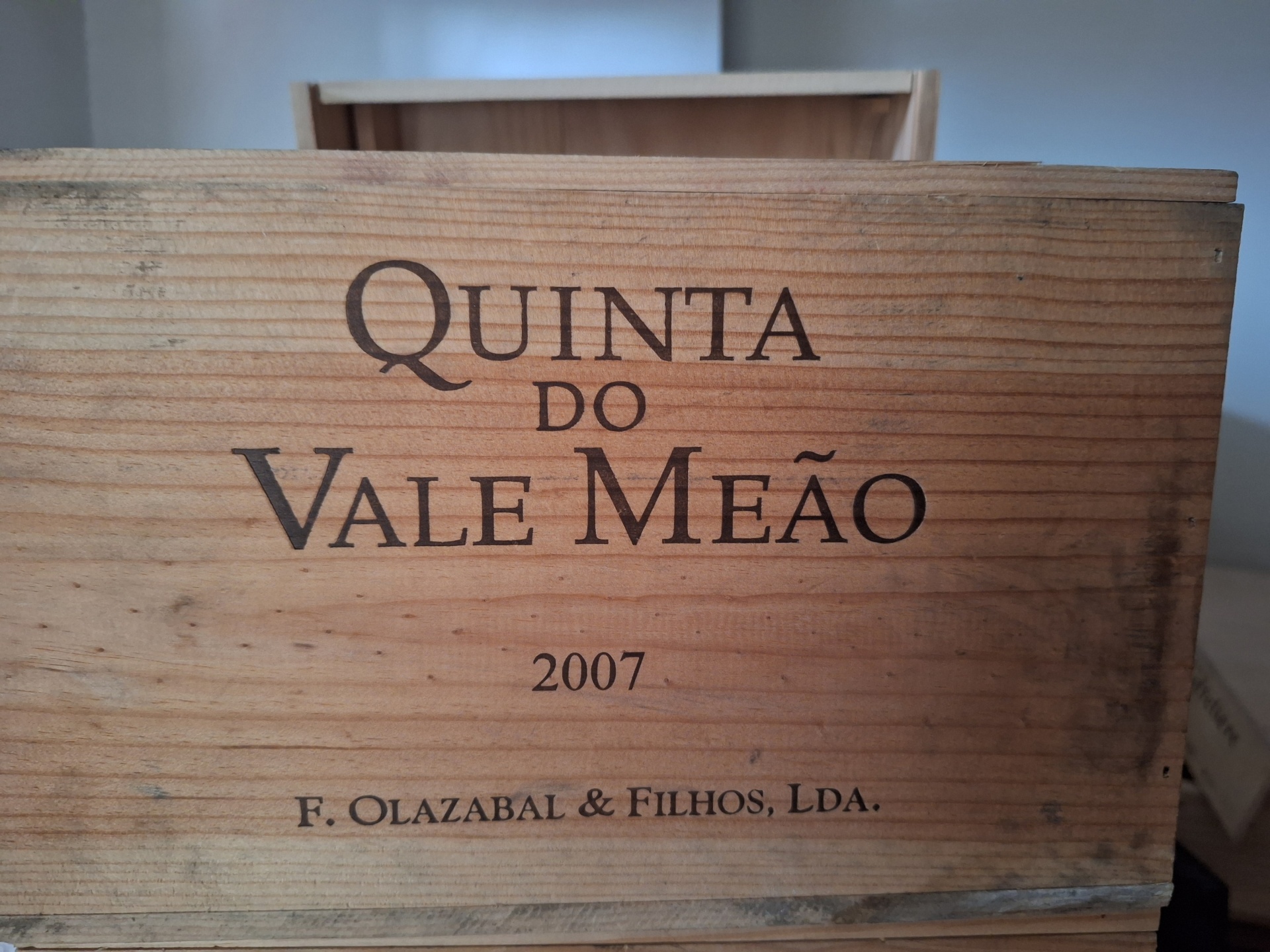 • Caixa de madeira clara gravada com texto Quinta do Vale Meão 2007