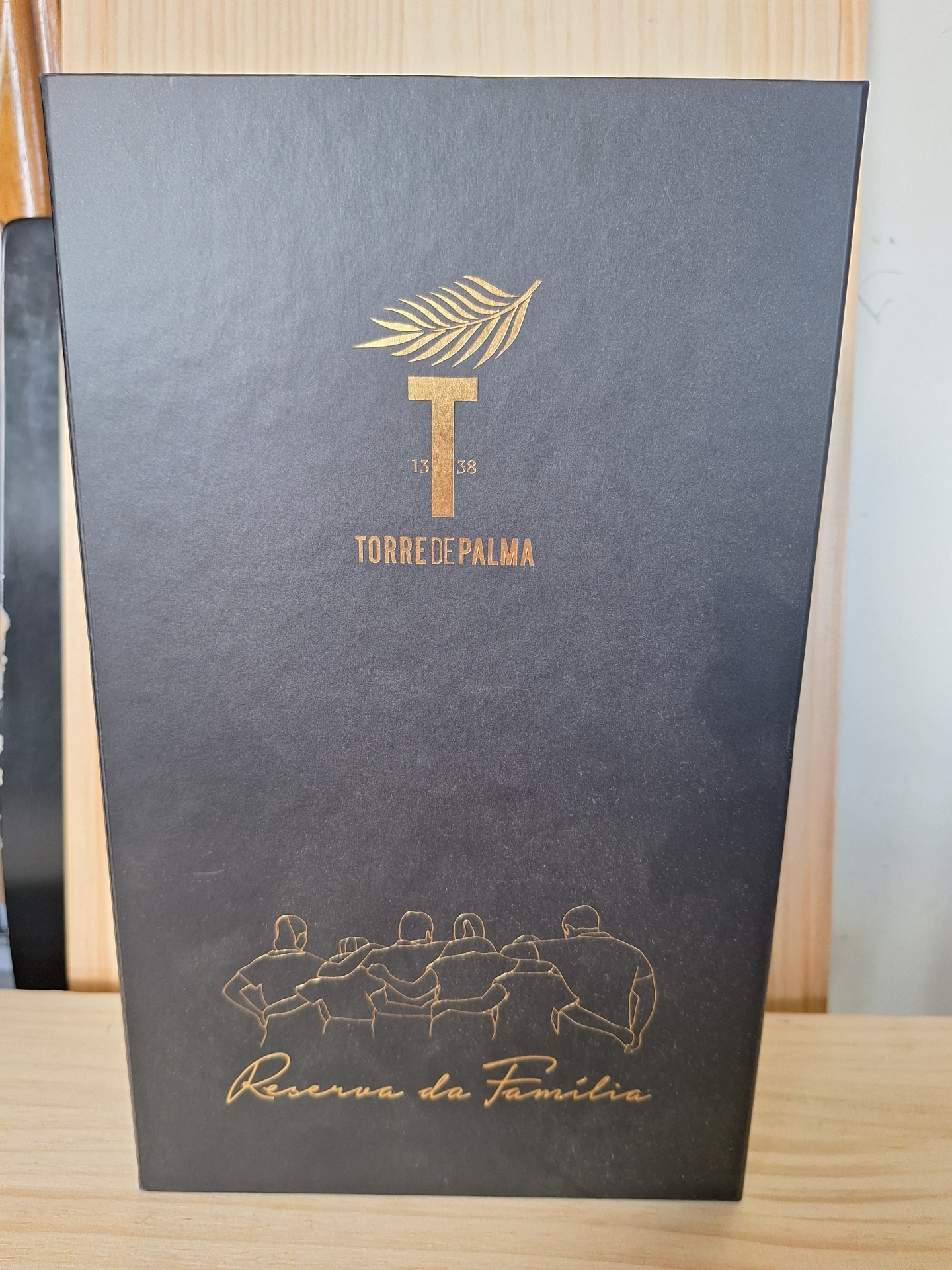 • Caixa preta de papelão rígido com gravação dourada Torres de Palma e desenho de cinco pessoas abraçadas